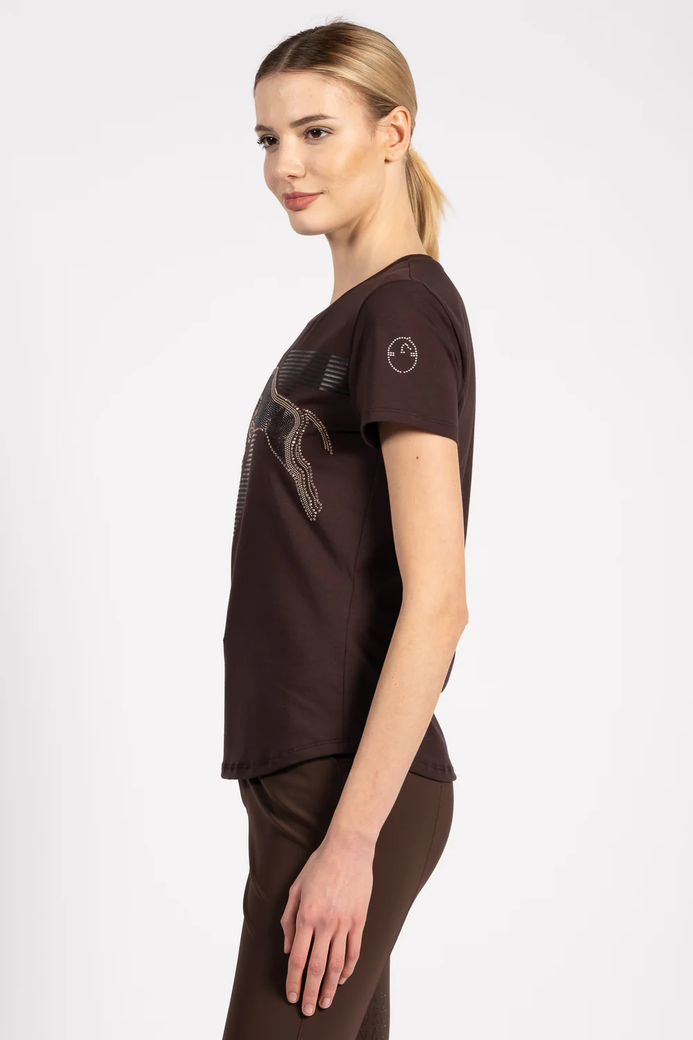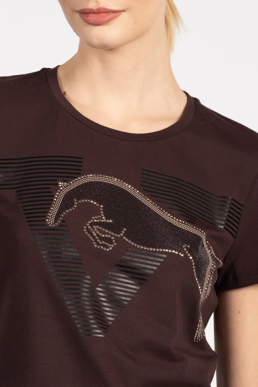 Vestrum Interlaken er laget av bomull, og har en skinnende grafikk på forsiden som viser en hest som hopper over «V»-en til Vestrum. «V»-en er formet av tofargede nagler som gir plagget karakter og bevegelse. Vestrum-logoen på venstre erme, også laget av mikronagler, fullfører designet med en lys og særegen detalj. Med en komfortabel passform og rene linjer er t-skjorten et originalt plagg som gir et ride- og feminint preg til dager i stallen eller på fritiden.